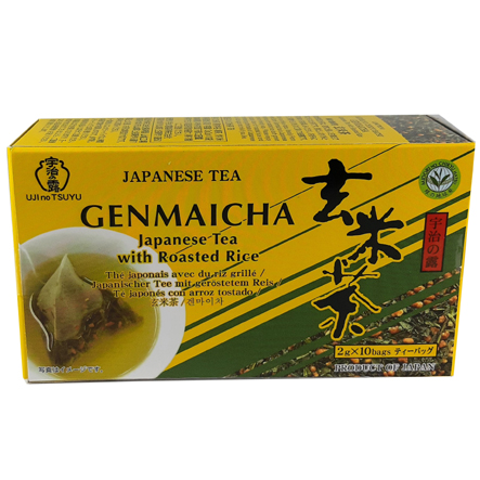 10x 2g sáčky japonského čaje Genmaicha. Genmaicha je zelený čaj, do které se přidává pražená hnědá rýže, která čaji dává specifickou nasládlou, praženou chuť. Obsahuje jen malé množství kofeinu. Nálev má světle žlutou barvu.