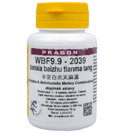WBF9.9-2039 banxia baizhu tianma tang je tradiční bylinná směs klasického složení. V balení je 36 tablet á 480 mg. Dávkování 1 - 4 tablety denně. Nejmodernější technologie výroby umožňují zpracování bylin tradičním horkovodním vývarem se současným zachytáváním těkavých éterických látek během varu.