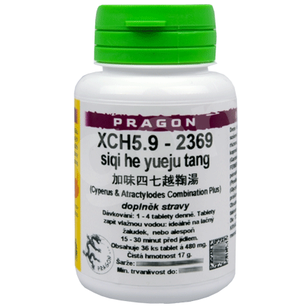 Další názvy: si qi he yue ju tang, jia wei si qi he yue ju tang, XCH5.9-2369. Balení obsahuje 36 ks tablet á 480 mg. Každá tableta odpovídá cca 2,4 g směsi zdrojových (sušených) bylinek. Koncentrace 5:1. Složení: šáchor, atraktylod, koprníček, gardénie, kvásek, šacholán, pórnatka, perilla, pinélie, lékořice.