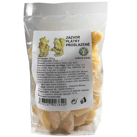 250g kandovaného zázvoru. Ideální pro mlsání místo bonbónů. Zázvor má protizánětlivé účinky, pomáhá udržovat v normálu imunitní systém, pomáhá udržovat normální funkce dýchacích cest, normální trávení.